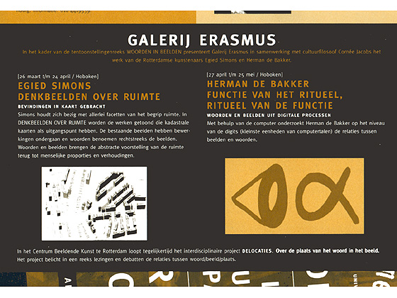 EGIED SIMONS 'DENKBEELDEN OVER RUIMTE' Bevindingen in kaart gebracht In het kader van de tentoonstellingenreeks Woorden in Beelden presenteert Galerie Erasmus het werk van de Rotterdamse kunstenaar Egied Simons. Egied Simons houdt zich met allerlei facetten van het begrip ruimte bezig. Startpunt voor zijn werk is vaak een bestaande voorstelling van de ruimte op het platte vlak, zoals we die bijvoorbeeld kennen van kadastrale kaarten en stadsplannen. Hij brengt bevindingen in kaart met andersoortige informatie. Dit biedt de kijker de mogelijkheid de ruimte anders te beleven. In de reeks Woorden in Beelden worden nu een aantal van deze werken getoond. Het denken over de verhouding tussen openbaar en privé is de aanzet geweest voor een aantal werken. In het werk Private marks / Public space krijgt alleen de particuliere ruimte massa. De openbare ruimte blijft zonder volume om de toegankelijkheid in beeld te brengen. Met woorden als bier, lamp, kado is seks is aangegeven wat men in die specifieke openbare ruimte kan vinden. In het werk Fractions of friction maakt hij het verschil tussen grondrecht en grondgebruik zichtbaar. Met behulp van twee over elkaar geschoven kaarten worden smalle stroken grond zichtbaar, waarvan het eigendomsrecht niet gelijk valt met het feitelijke gebruik ervan. In het werk Blind spots markeert hij de plekken op de kaart waar zich blindgangers uit de Tweede Wereldoorlog bevinden. Op zo'n plek bolt bij Simons de kaart vervaarlijk op. Het lijkt alsof de zaak elk moment kan ontploffen. Door dit soort informatie ruimtelijk in kaart te brengen worden meer verborgen of niet goed gekende niveau's van informatie zichtbaar en daardoor kan de plek zelf anders beleefd worden. Een aantal van genoemde werken is gemaakt met de databank (optitheek) van de Dienst Gemeentewerken Rotterdam. In het kader van het project Delocaties 02, De Fictionele Stad over de plaats van het woord in het beeld, zijn kunstenaars in de gelegenheid gesteld de digitale foto- en databank van Gemeentewerken te gebruiken (Centrum Beeldende Kunst 1996). In Samples 1 en 2 voegt Simons aan panoramafoto's van de optitheek tekstbalkjes toe. De ene keer benoemt hij in de tekstbalken aanwezige voorwerpen en mensen in de ruimte, zoals boom, kind, auto, brommer, paal. Een andere keer benoemt hij kleuren en elementen uit de ruimte, bijvoorbeeld zwart, wit, vlak en streep. In een ander werk worden aan zwart-wit foto's kleurbalken toegevoegd. Op deze manier voegt Simons ontbrekende informatie toe in zijn meest rudimentaire vorm, ook weer om een andere beleving mogelijk te maken. Naast de werken naar grafische voorstellingen van de ruimte werkt Simons soms met geluid om een belevingsniveau aan een bepaalde ruimte toe te voegen. Ook maakt hij drie-dimensionaal werk in de openbare ruimte. Ook dit soort werk is steeds een reflectie over de functie en indeling van de ruimte. Met minimale middelen scherpt Simons het bewustzijn over een specifieke plek. De woorden bij Simons benoemen vaak rechtstreeks de dingen in de beelden. De beelden zijn vaak bestaande voorstellingen die verschillende bewerkingen hebben ondergaan. Samen brengen de woorden en de dingen de abstracte voorstelling van de ruimte, zoals die van de kaart, terug tot menselijke proporties en verhoudingen. Het programma Woorden in Beelden komt tot stand in samenwerking met Cornée Jacobs, cultuurfilosoof.