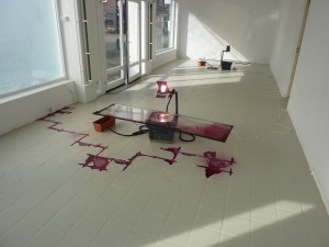 Rode wijn en bakolie zijn de bestanddelen die hij koos om tot vloeipunten te komen. Via een slang druppelen de vloeistoffen op een glasplaat die op een overheadprojector ligt. De impact van vallende druppels zet zich voort op de glasplaat, druppels vormen opzwellende aderen en uiteindelijk stroompjes die weer teruggepompt het proces op gang houden. Ook de warmte van de projector speelt een rol. De stromen zijn continu in beweging, op zoek naar een vast punt.