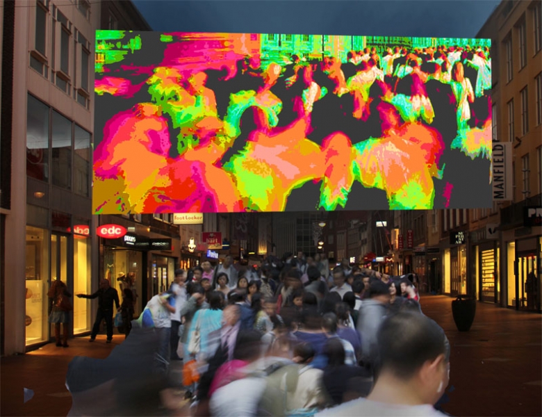 Een warmtegevoelige camera filmt het publiek op de rug, de beelden worden realtime geprojecteerd op het vlak boven Le Connaiser. De bezoekersstroom wordt weergegeven als een bewegende kleurmassa, details vallen weg. Het publiek loopt naar schuin op de looprichtingstaande projectievlak toe, de looprichting is gelijk aan de richting van de geprojecteerde beelden. De beweging van de bezoekersstroom wordt hiermee ondersteund, er ontstaat als het ware een kop-staart verbinding. De bezoeker is niet alleen toeschouwer maar ook deelnemer.