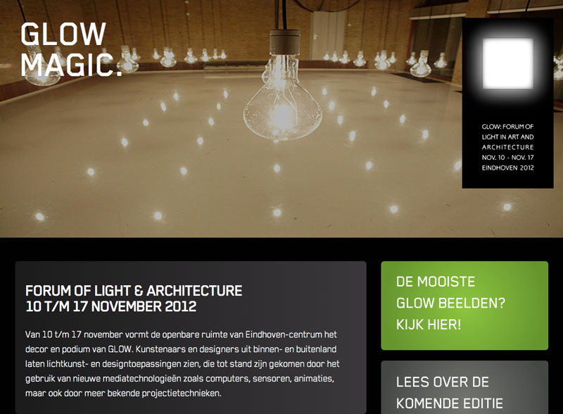 Deelnemersveld GLOW: Afterlight, Skertzò, Femke Schaap, Michel Suk, Sabine Lang & Daniel Baumann, Jan Ising, Group Laps, Edwin van der Heide, Richi Ferrero, Joris Strijbos, Teresa Mar, Ralph Brodruck, TILT, Atelier LEK, Subuk, Gijs van Bon, Egied Simons, Sigrid Sandmann, molitor & kuzmin, Les Orpailleurs de Lumière. Deelnemersveld GLOW-S: Afterlight, YesYesNo, Usman Haque, Cantoni-Crescenti, Dieter Vandoren, Gabey Tjon a Tham, Kurt Laurenz Theinert, Lummo.
