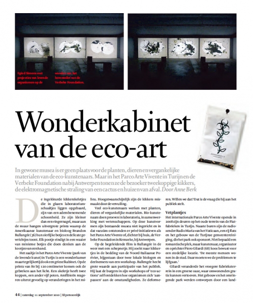 In gewone musea is er geen plaats voor de planten, dieren en vergankelijke materialen van de eco-kunstenaars. Maar in het Parco Arte Vivente in Turijn en de Verbeke Foundation nabij Antwerpen tonen ze de bezoeker tweekoppige kikkers, de elektromagnetische straling van een cactus en huizen van afval. Door Anne Berk De ingekleurde kikkerskeletjes die in glazen laboratoriumschaaltjes liggen opgebaard, zijn van een adembenemende schoonheid. Ze zijn kleiner dan een vingernagel, maar aan de muur hangen uitvergrote prints waarop de Amerikaanse kunstenaar en bioloog Brandon Ballangée (36) hun sierlijke botjes en delicate gewrichtjes toont. Elk pootje eindigt in een waaier van minieme botjes die doen denken aan de kootjes van een hand. Het zaaltje in het Parco Arte Vivente (park van de levende kunst) in Turijn is een wonderkamer maar tegelijkertijd ook een griezelkabinet. Op de prints van 80 bij 120 centimeter komen ook de gebreken aan het licht. Een skeletje heeft twee koppen, een ander vijf poten. Amfibieën reageren uiterst gevoelig op veranderingen in het milieu. Hoogstwaarschijnlijk zijn de kikkers mismaakt door de vervuiling. Veel eco-kunstenaars werken met planten, dieren of vergankelijke materialen. Bio-kunstenaars doen proeven in laboratoria, in samenwerking met wetenschappers. Op deze kunstvormen zijn bestaande musea niet ingericht en in dat vacuüm ontstonden er privé-initiatieven als het Parco Arte Vivente of, dichter bij huis, de Verbeke Foundation in Kemzeke, bij Antwerpen. Op de begeleidende film is Ballangée in de weer met een schepnetje. Hij zoekt naar kikkertjes in de bedding van de Noord-Italiaanse Porivier, bijgestaan door twee lokale biologen en deelnemers van een workshop. Ballengée hecht grote waarde aan participatie van het publiek. Hij laat de burgers in zijn workshops of ‘eco-actions’ zelf ontdekken hoe organismen zich ‘aanpassen’ aan de omstandigheden. Ze deformeren. Willen we dat? Dat is de vraag die hij aan het publiek stelt. Vetplantjes Het internationale Parco Arte Vivente opende in 2008 zijn deuren op het oude terrein van de Fiatfabrieken in Turijn. Naaste buren zijn de radiozender Radio Maria van het Vaticaan, een rij flats en het gebouw van de Turijnse gemeentereiniging, die het park ook sponsort. Niet bepaald een romantische plek, maar kunstenaar, organisator en oprichter Piero Gilardi (68) koos bewust voor een stedelijke locatie. ‘De meeste mensen wonen in de stad. Daar moeten we de problemen te lijf gaan.’ Gilardi veranderde het vroegere fabrieksterrein in een groene oase, waar omwonenden gratis kunnen vertoeven. Het gebouw en het omringende park werden ontworpen door een land-schapsarchitect en een bio-architect. De smaakvolle entree doet denken aan een plantenkas, maar het grootste deel van het gebouw gaat schuil onder de aarde. Dat spaart niet alleen energie, net als de zonnecellen die op het glas zijn aangebracht, maar de heuvel biedt ook ruimte aan de natuur. Zo is het dak bedekt met vetplantjes die zijn geplant in de vorm van een mandala. Het zijn zestienhonderd Sedums, weet Gilardi, die ze samen met de Franse ontwerper Gilles Clément (67) een voor een in de grond heeft gezet. Met de mandala-vorm wil de tuinarchitect en schrijver mensen aan het denken zetten over de waterschaarste en de biodiversiteit. De vetplantjes stellen nauwelijks eisen aan de bodem en je hoeft ze niet te sproeien. Uitweg Piero Gilardi, tanige gestalte, melancholieke blik, was de motor achter de Arte Povera-beweging, een kunststroming die begon in 1967 en met ‘arme’ en natuurlijke materialen werkte. Gilardi is tevens een activist, die protesteert tegen de komst van een vuilverbrandingsinstallatie. ‘Zo kunnen we niet doorgaan. Het economisch denken is gebaseerd op oneindige groei, maar de grondstoffen van de aarde zijn eindig. We moeten zoeken naar een uitweg uit de wereldwijde ecologische crisis.’ Gilardi is ervan overtuigd dat kunst een rol kan spelen in dit bewustwordingsproces. Daarom richtte hij het Parco Arte Vivente op, een podium voor eco-kunstenaars, waarvan het hart wordt gevormd door zijn grensverleggende Bioma-project. Het project bestaat uit zeven donkere kamers waar Gilardi natuurprocessen zichtbaar maakt die je met het blote oog niet kunt zien. Daarvoor gebruikt hij de modernste technieken en werkt hij intensief samen met een wetenschapper. In een van de ruimten wordt de beweging van water omgezet in geluid. In een andere zie je hoe de geur van een citroen met behulp van een computer wordt omgezet in beeld . In een derde zie je de elektromagnetische straling van een cactus of een schelp, die reageert op de straling van je lichaam als je ze aanraakt. Als je je mobieltje erbij pakt, raakt het patroon van deze energiegolven verstoord. Het indrukwekkendst is de ruimte waarin met behulp van wiskundige formules het groeiproces van een plant wordt geprojecteerd op een scherm. Het levert expanderende en weer afstervende driedimensionale organismen op. Een proces waar nooit een eind aan komt. De natuur is een wonder, vindt Gilardi. Levende kunst Ook bij de Verbeke Foundation in België floreert de eco-art. Het natuurgebied van 12 hectare en de tentoonstellingsruimten van 20.000m2 vormen een proeftuin die kunstenaars prikkelt om er te werken. Een doolhof waar de bezoeker op avontuur kan gaan. De Foundation werd in 2007 opgericht door Geert Verbeke (57), oud-directeur van een transport- en overslagbedrijf. Verbeke’s liefde voor de kunst ontwaakte toen hij op een dag enorme stalen beelden moest vervoeren. Hij begon met het verzamelen van collages en assemblages, waarna zijn belangstelling verschoof naar levende kunst, van de performancekunst uit de jaren zestig tot de eco-art van vandaag. In 2003 besloot hij zijn bedrijf te verkopen, om op deze locatie een experimenteel kunstcentrum te vestigen, ‘De show is onaf, in beweging, zit vol tegenstrijdigheden, is onharmonieus en vooral levend.’ Superweed Bij binnenkomst stuit je op het Garbage City Holiday 