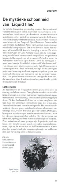 De Verbeke Foundation, gevestigd op een meer dan tweeduizend vierkante meter groot terrein ten westen van Antwerpen, is momenteel een van meest spraakmakende en vooruitstrevende instellingen op het gebied van moderne kunst in de Benelux. Men vindt er een permanente collectie, waarin werken van onder meer Martin uit den Boogaard, Sjoerd Buisman, Panamerenko, Luc Tuymans, Jan Fabre en Atelier Van Lieshout, maar ook steeds wisselende kunstprojecten. Dit is een bewuste keuze; het museum wil nadrukkelijk kunst in beweging tonen. De initiatiefnemers Geert en Carla Verbeke bieden om die reden regelmatig verschillende kunstenaars de mogelijkheid om gedurende langere tijd kunstprojecten uit te voeren. Zo is deze zomer de Rotterdamse kunstenaar Egied Simons (1958) bij hen te gast. Simons toont hier zijn 'Liquid files', vrij vertaald 'Vloeibaar archief'. Het zijn een soort diapreparaten, waarin Egied Simons uiterst kleine organismen, dood en levend, vastlegt, die hij vervolgens projecteert. Iedere dag worden de preparaten opnieuw gevuld met materiaal afkomstig van het terrein van de Verbeke Foundation. Het geheel vormt een constant bewegende installatie, die haarscherp, bijna driedimensionaal vergroot, inzicht geeft in de structuren van de natuur.