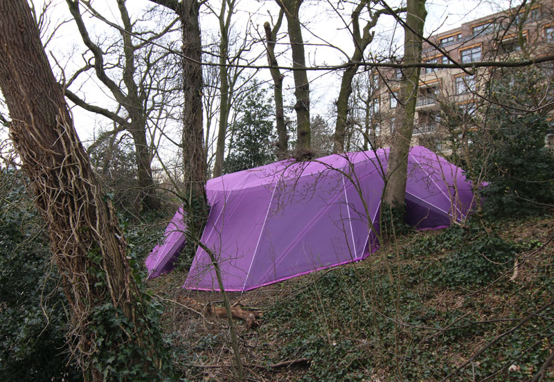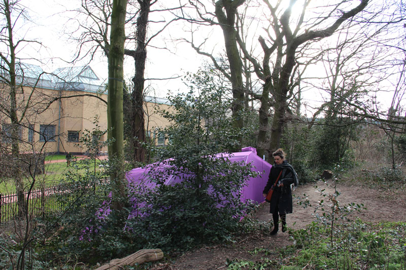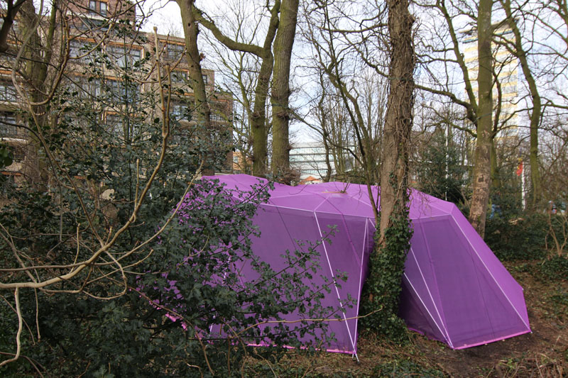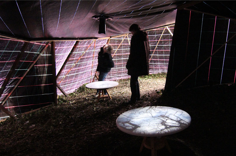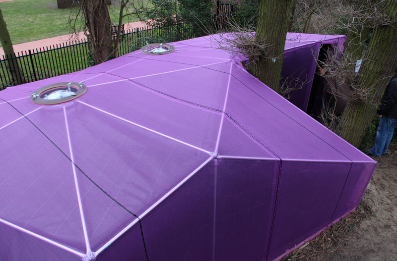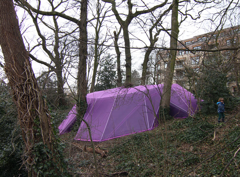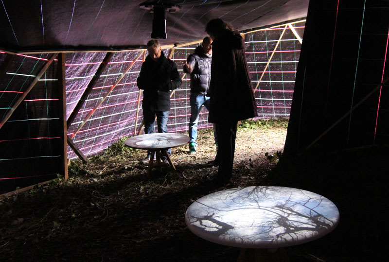 A camera obscura has been created in a polygon construction built among trees on the sand dune next to the museum. Two lenses are pointed straight up towards the crowns of the trees. Leaves and branches moving in the wind and passing clouds are being projected onto round tables. The trees are part of the artwork. The purple gauze on the outside will gradually become overgrown with climbing ivy. The depth of field can be adjusted by gently turning the table top.