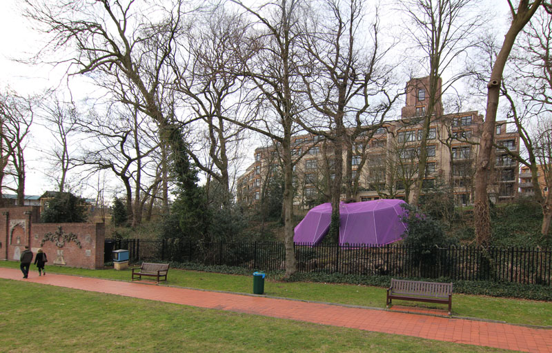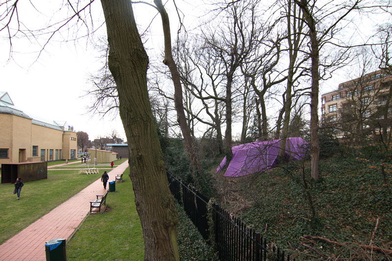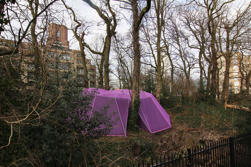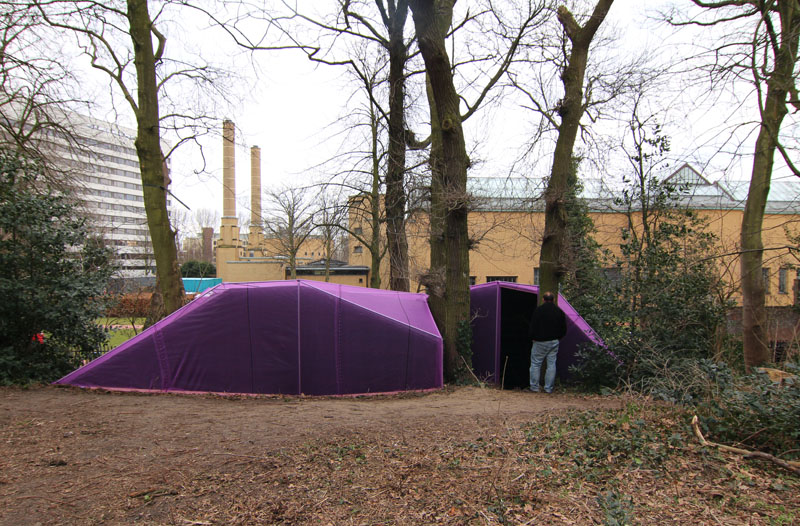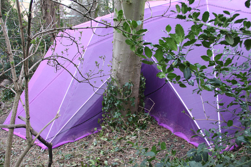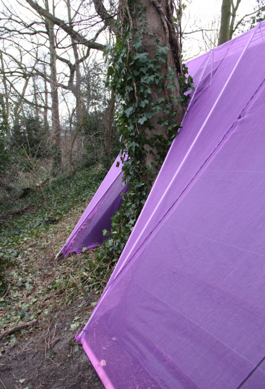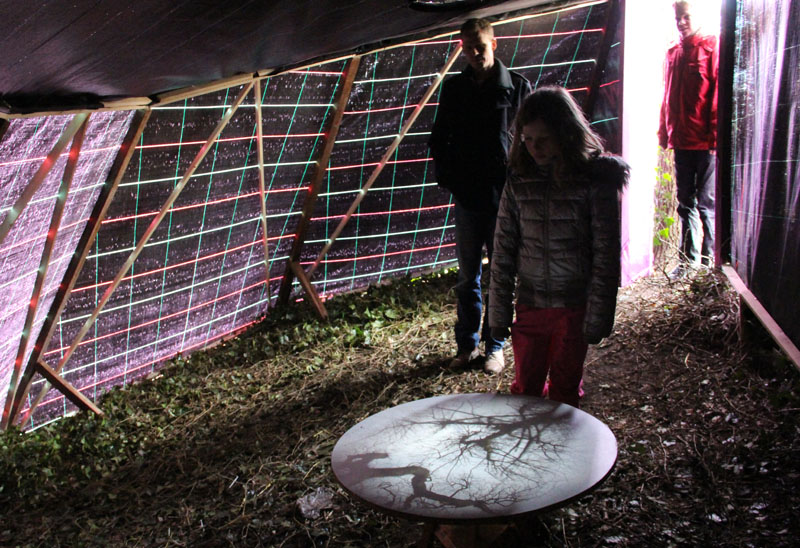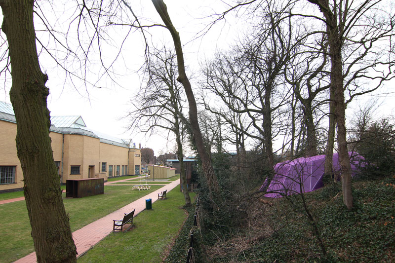 A camera obscura has been created in a polygon construction built among trees on the sand dune next to the museum. Two lenses are pointed straight up towards the crowns of the trees. Leaves and branches moving in the wind and passing clouds are being projected onto round tables. The trees are part of the artwork. The purple gauze on the outside will gradually become overgrown with climbing ivy. The depth of field can be adjusted by gently turning the table top.