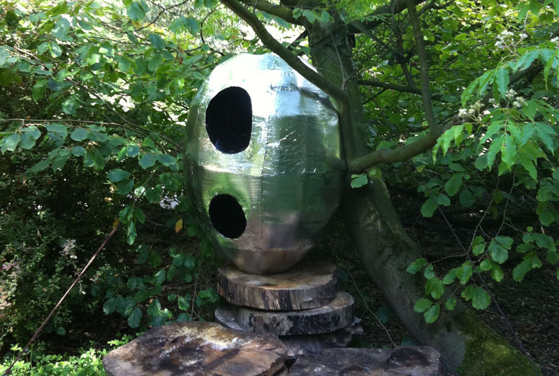 Onder de bijenboom (Evodia daniellii) is een zilverkleurig ei geplaatst met twee gaten. Door het bovenste gat kun je naar binnen kijken. Je ziet de bladeren en de takken van de boom geprojecteerd op een rond blad. Door het onderste gat kun je aan een hendel draaien. Hiermee draai je het blad naar boven of beneden en stel je scherp op een bepaald deel van de boom. Bijen komen af op de vruchten van de boom, je ziet ze vliegen tussen de bladeren.