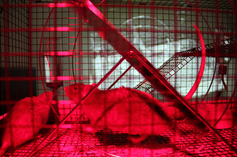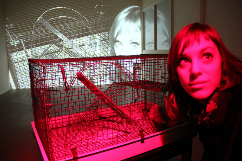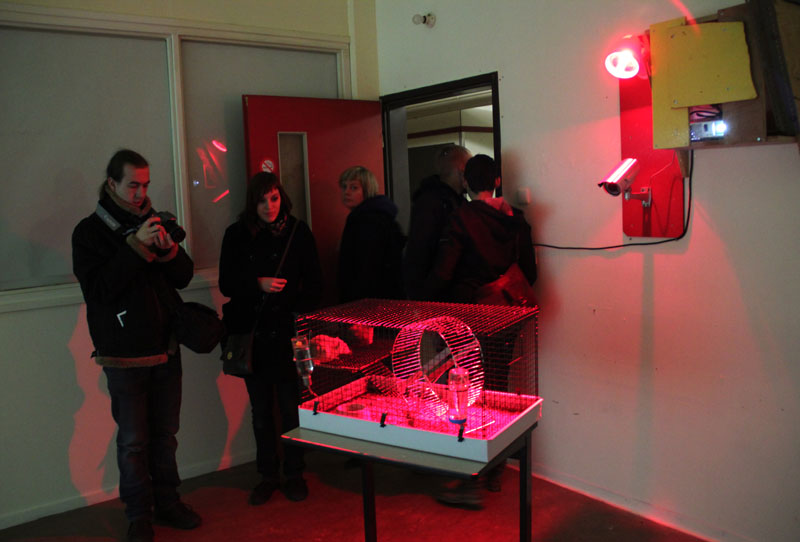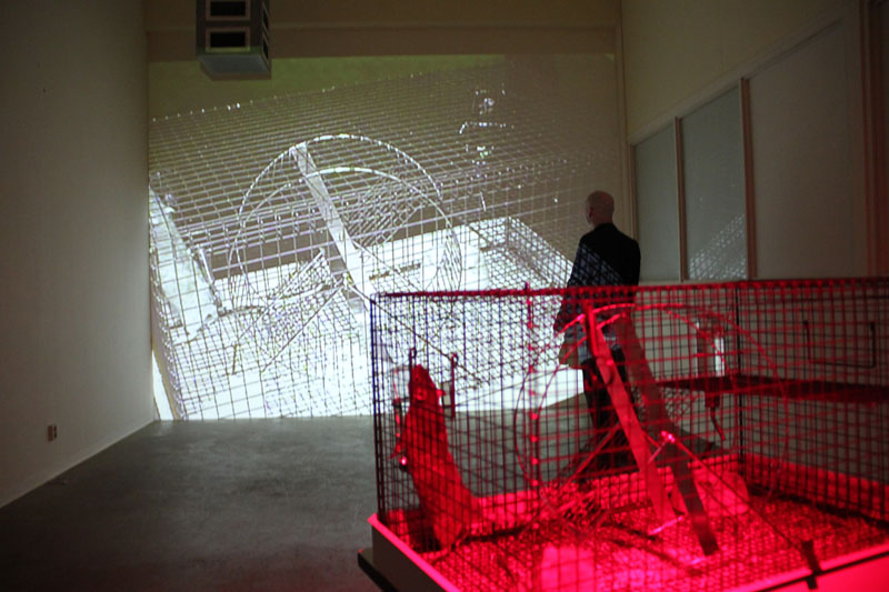 Two rats in a cage illuminated by infra red light, were filmed by an infra red camera. The enlarged images were projected on a wall in the same room. The installation showed the real situation of the rats in the cage and the enlarged graphic translation on the wall at the same time.