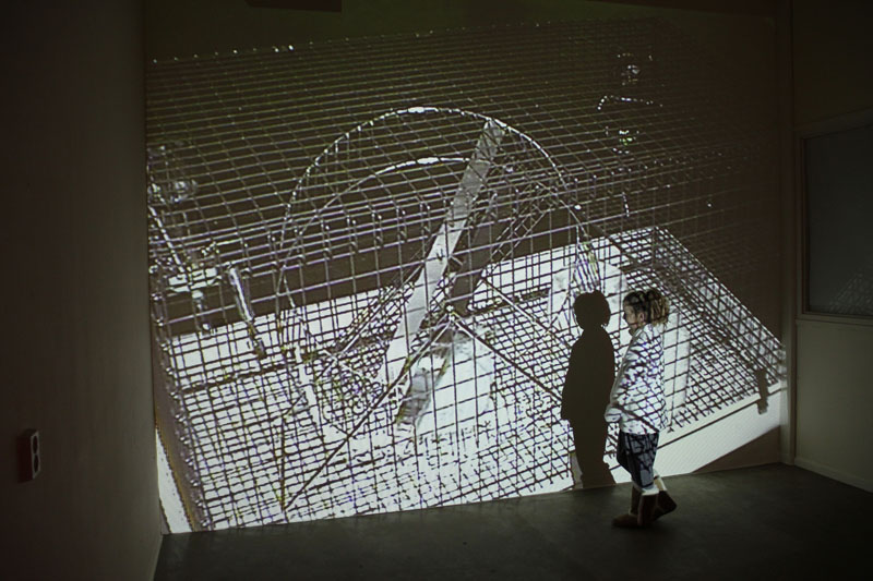 De (zwart-wit) beelden worden met behulp van een beamer life geprojecteerd op de achterwand van de ruimte.